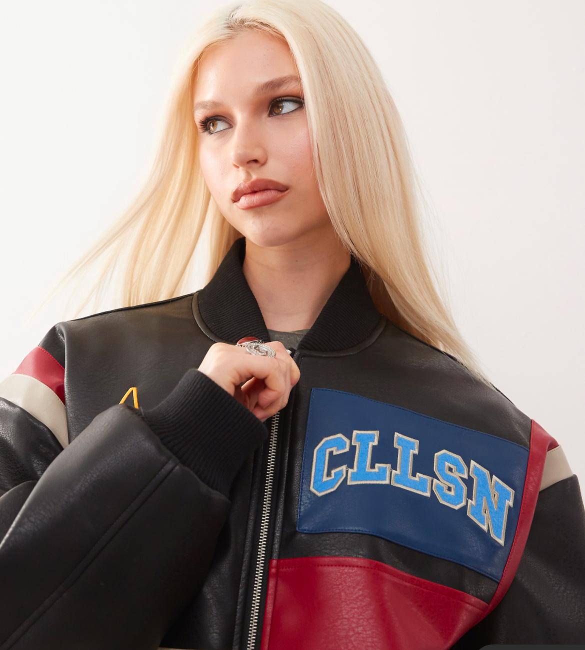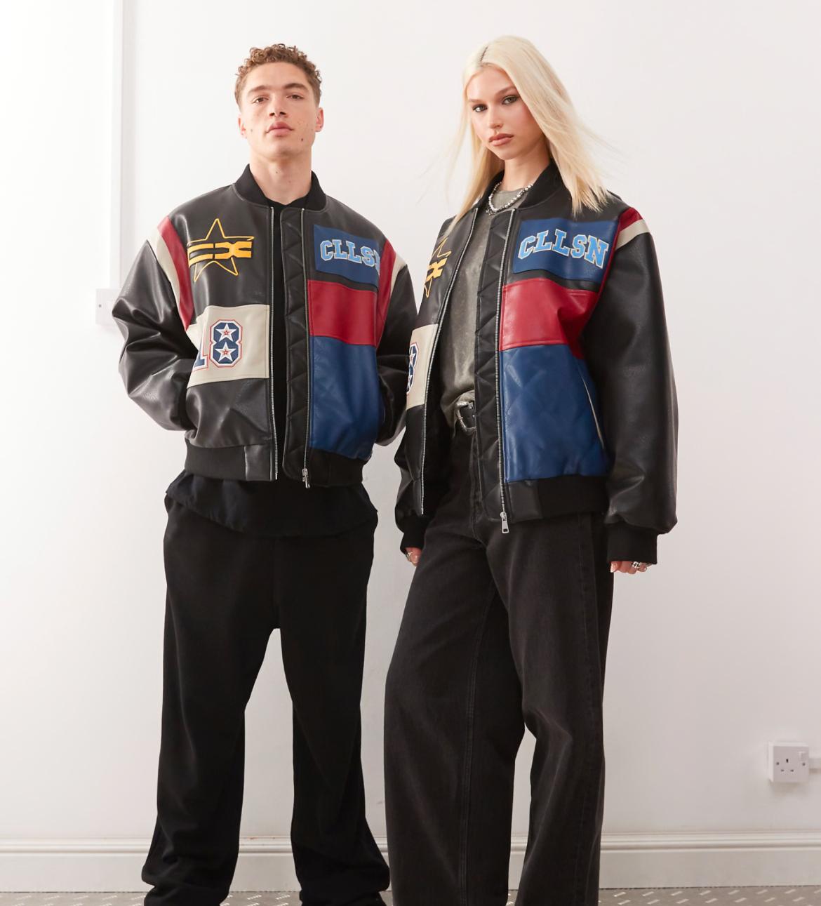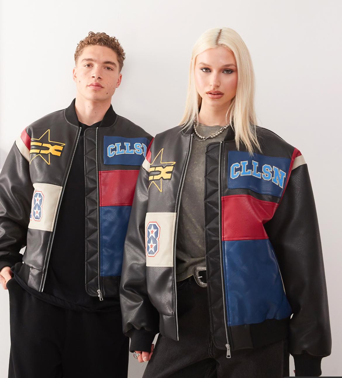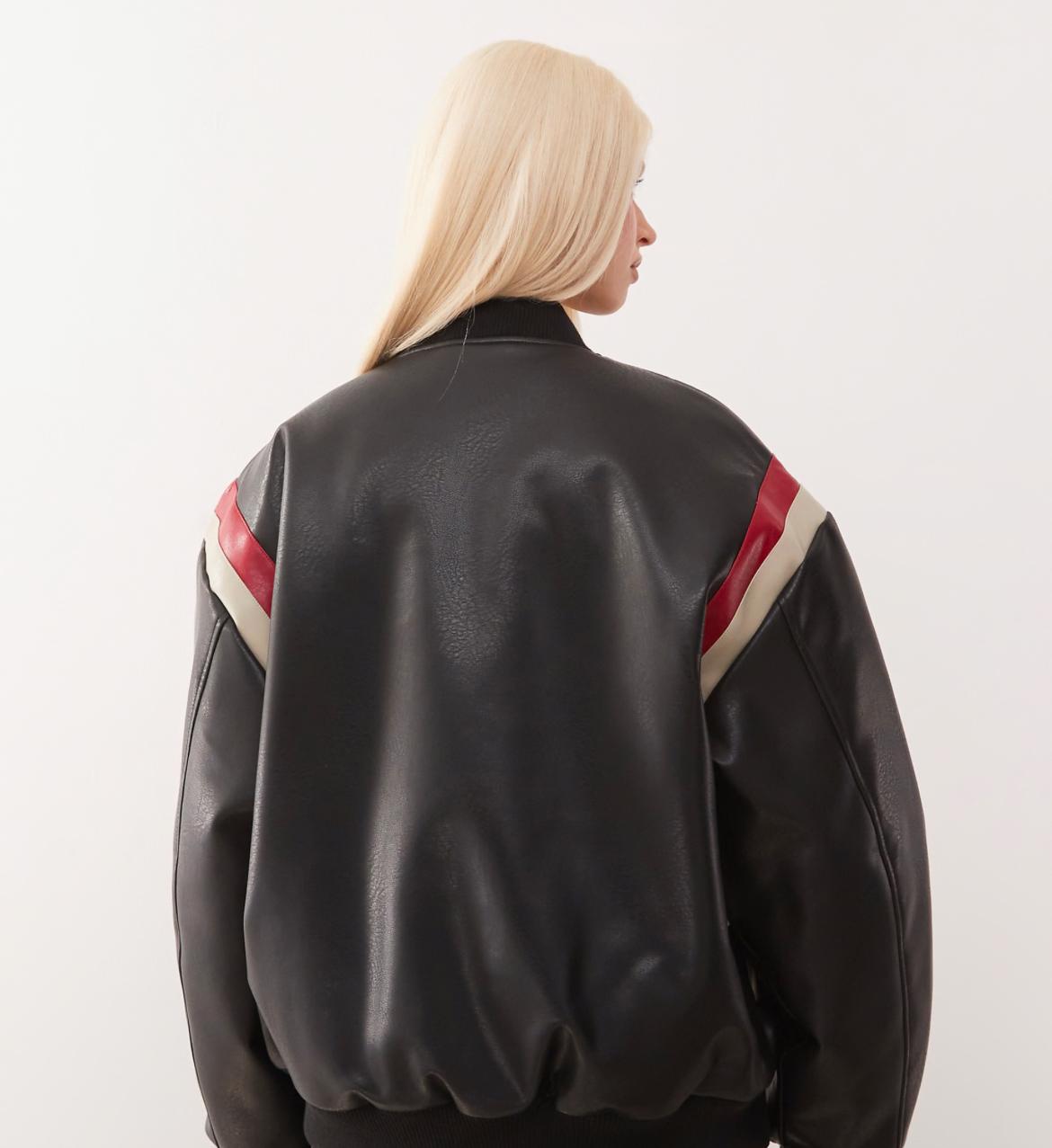 COLLUSION Unisex leather look patch work bomber in black quantity
